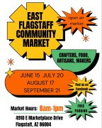 The East Flagstaff Community Market (EFCM) started in 2023 and has had two successful seasons at the Flagstaff Subaru parking lot. For its third season, the market is moving to the Flagstaff Mall parking lot, near Desert Financial Credit Union. EFCM takes place on the 3rd Saturday of the month from May to September. The market starts at 8am- 1pm, rain or shine. The East Flagstaff Community Market features a range of handcrafted goods and original artwork from local Flagstaff vendors, along with food trucks offering delicious eats and treats.